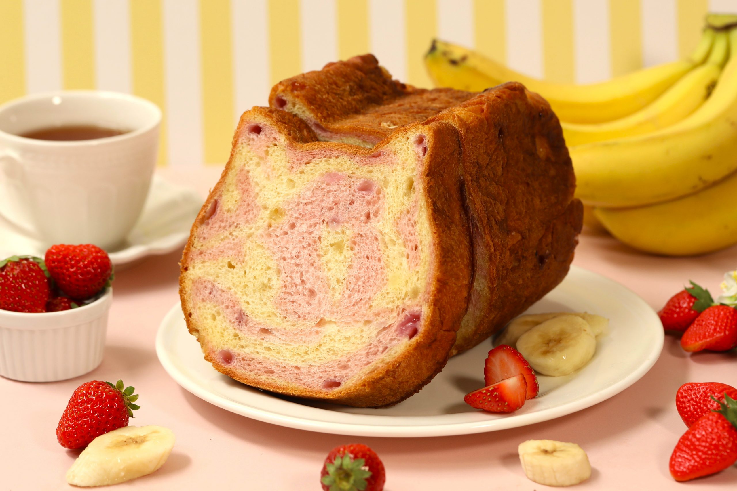 つぶジャムいちごを練りこんだいちご風味の生地と、つぶジャムバナナを練りこんだバナナ風味の生地をあわせて、鮮やかなゼブラ模様に焼き上げました🦓