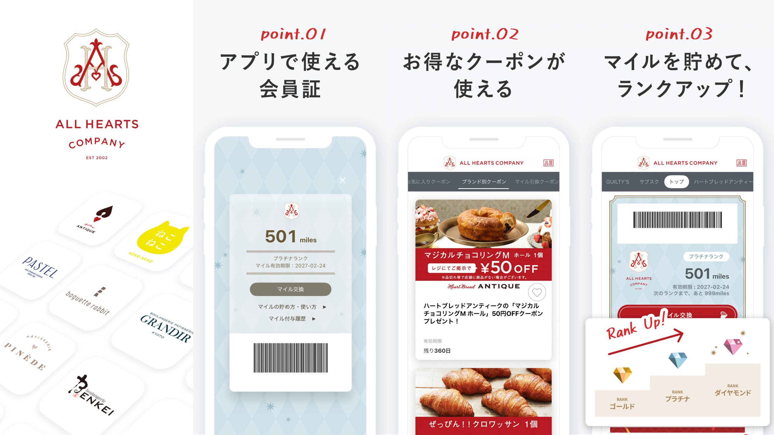 ねこねこ食パン、ハートブレッドアンティーク、パステルなど、株式会社オールハーツ・カンパニーの運営する各ブランドを1つのアプリに集約!お得なクーポンや最新ニュースをわかりやすく配信いたします📝また、お買い上げ金額に応じてマイルをプレゼント!貯まったマイルは店舗で使えるクーポンに交換いただけます✨