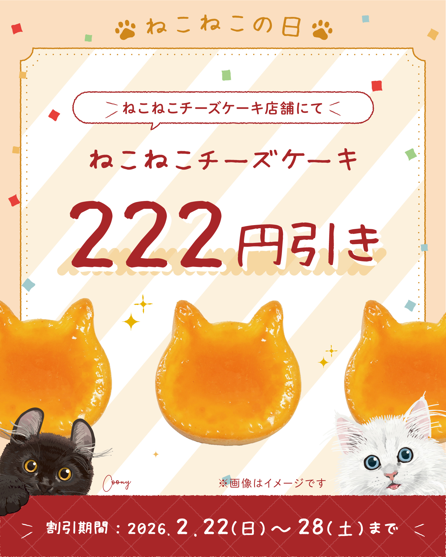 2026年2月22日(日)~2026年2月28日(土)の期間限定で「ねこねこチーズケーキ」1個を222円引きでお買い求めいただけます✨